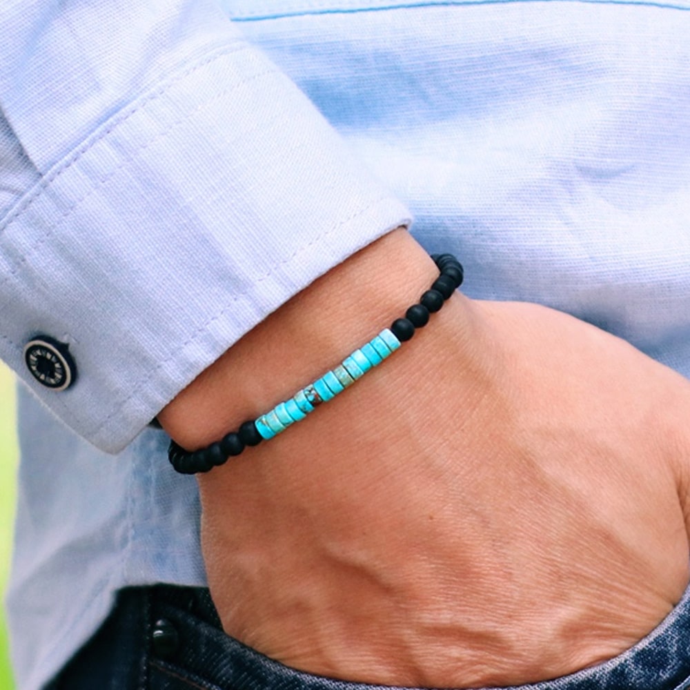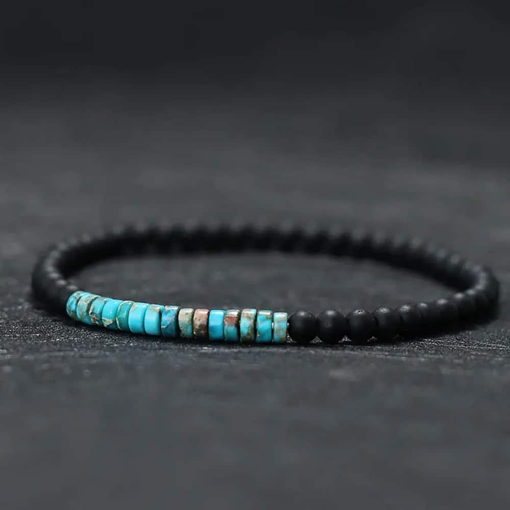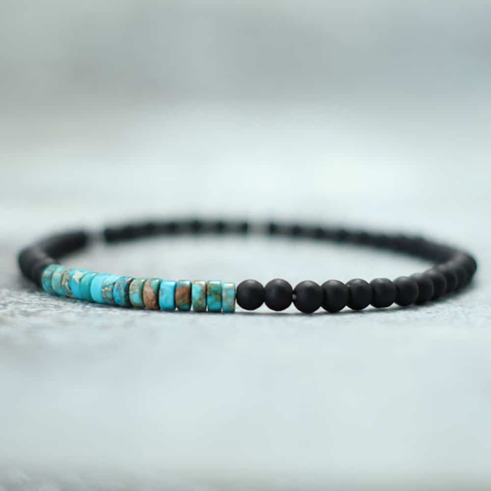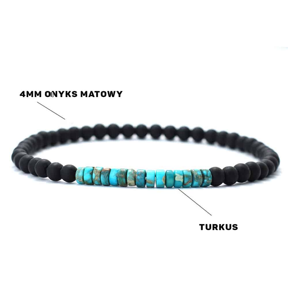 Oryginalna, elegancka, delikatna i bardzo ładna stylowa bransoletka z kamieniami onyks matowy i turkus, wykonana z nawleczonych kulek i walców o rozmiarze 4 mm na elastyczną wytrzymałą gumkę kauczukową.